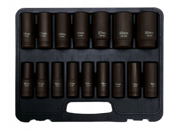 Przedstawiamy zupełnie nowy zestaw nasadek udarowych AD-16D, w skład zestawu wchodzi 16 sztuk nasadek udarowych długich w najpopularniejszych rozmiarach. w tym także rzadko spotykane w innych zestawach nasadki w rozmiarach 27 mm, 30 mm oraz 32 mm.
