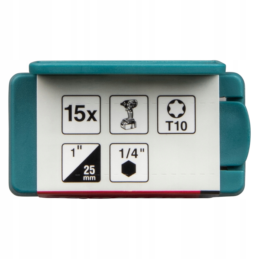 Końcówki wkrętakowe z precyzyjnym mocowaniem. Opakowanie zawiera 15 bitów torx Impact Premier T10 o długości 25 mm i trzpieniu sześciokątnym ¼″. Te magnetyczne bity są zapakowane w plastikowe pudełko, co ułatwia przechowywanie.