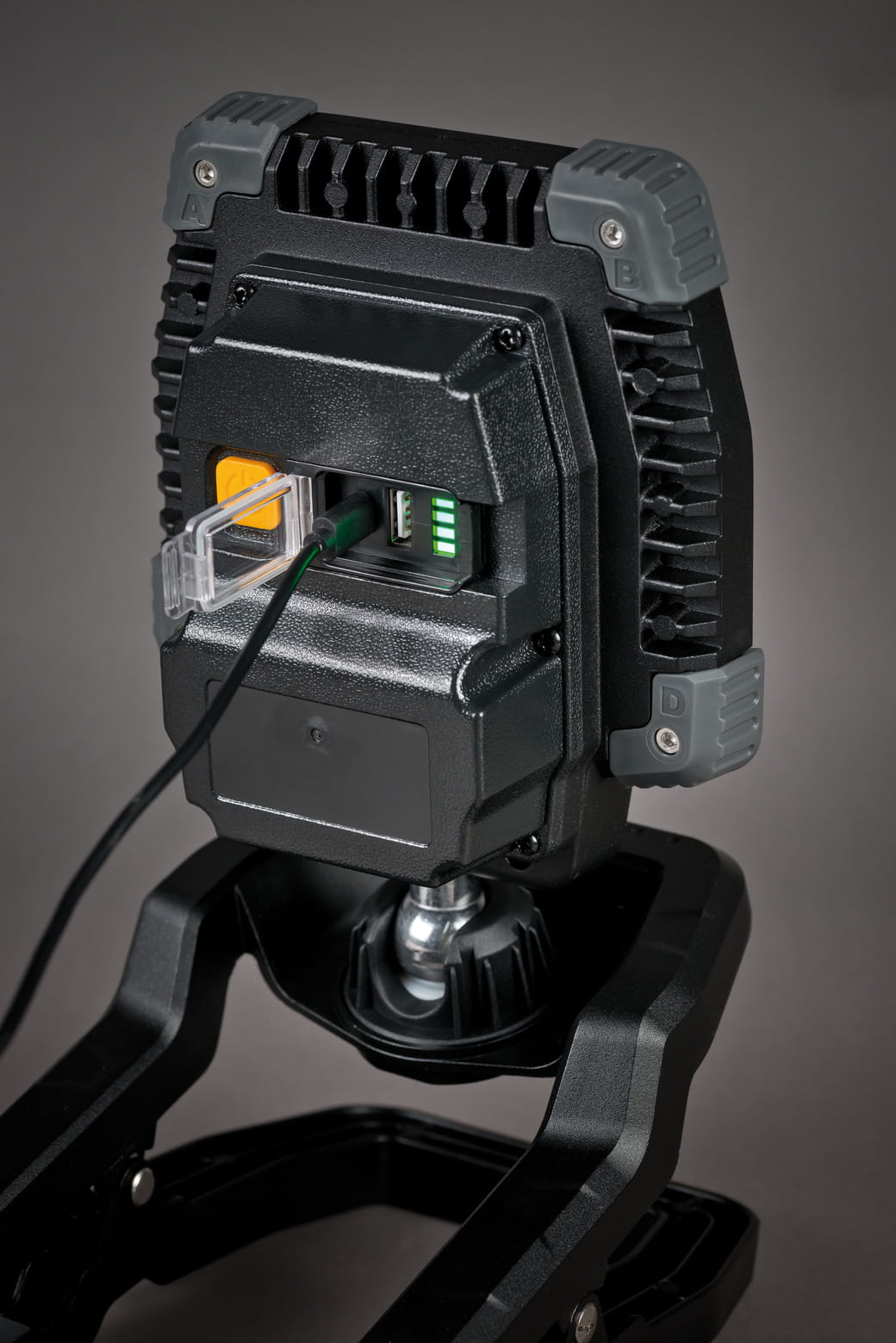 - Solidny reflektor LED o mocy 40 W z obudową odporną na stłuczenia i uderzenia - z wbudowanym akumulatorem litowo-jonowym (7,4 V/ 5 Ah), wskaźnikiem ładowania i kablem USB typu A/C