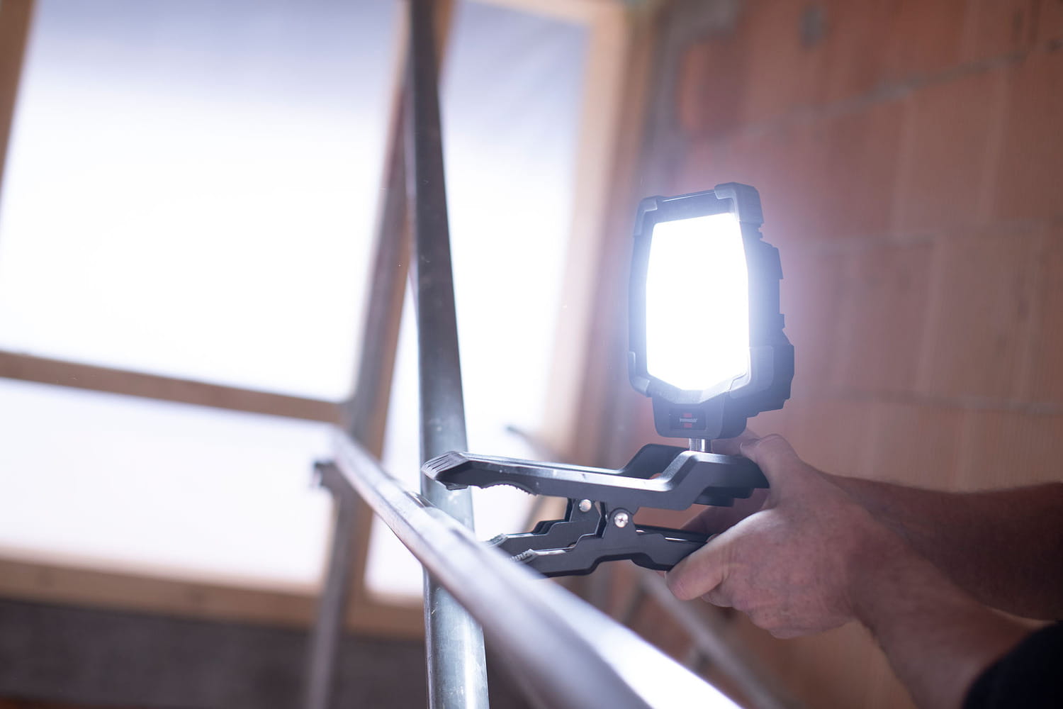 - Lampa robocza LED z urządzeniem zaciskowym dla większej elastyczności i funkcji, dzięki szerokości mocowania do 55 mm, do użytku domowego i rzemieślniczego lub w warsztatach