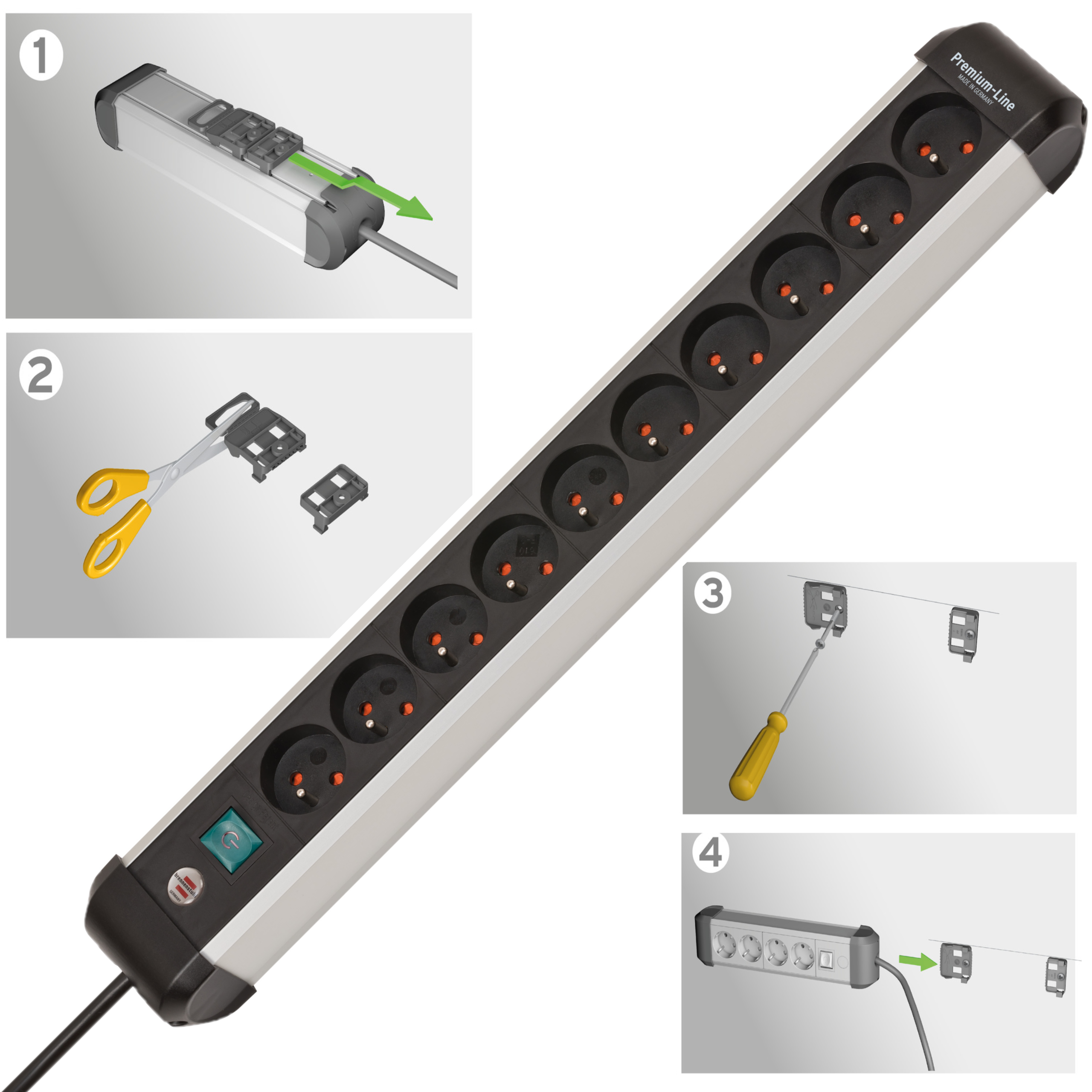 Listwa zasilająca Premium-Alu-Line z 10 gniazdami w smukłej obudowie służy jako optymalne źródło zasilania w biurze domowym lub w miejscu pracy. Listwa zasilająca z podświetlanym wyłącznikiem bezpieczeństwa (dwubiegunowym) i oszczędzającymi miejsce gniazdami w układzie 45° może być zamontowana na ścianie lub nawet na nodze stołu dzięki innowacyjnej koncepcji montażu. Gniazdo wielokrotne z podwyższoną ochroną styków przekonuje również następującymi cechami:
