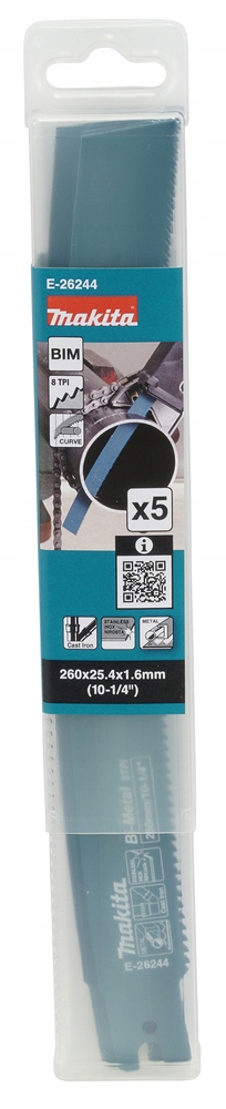 Brzeszczot do piły szablastej do cięcia metalu, żeliwa i stali nierdzewnej. Gruby i sztywny brzeszczot został zaprojektowany specjalnie do pił szablastych z imadłem łańcuchowym. Ma długość całkowitą 260 mm i długość roboczą 232 mm. Grubość brzeszczotu wynosi 1,6 mm, a liczba zębów na cal (TPI) wynosi 8. Opakowanie zawiera 5 brzeszczotów.