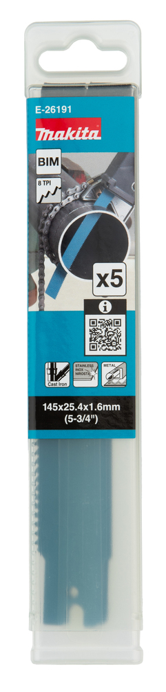 Brzeszczot do piły szablastej do cięcia metalu, żeliwa i stali nierdzewnej. Gruby i sztywny brzeszczot został zaprojektowany specjalnie do pił szablastych z imadłem łańcuchowym. Ma długość całkowitą 145 mm i długość roboczą 117 mm. Grubość brzeszczotu wynosi 1,6 mm, a liczba zębów na cal (TPI) wynosi 8. Opakowanie zawiera 5 brzeszczotów.
