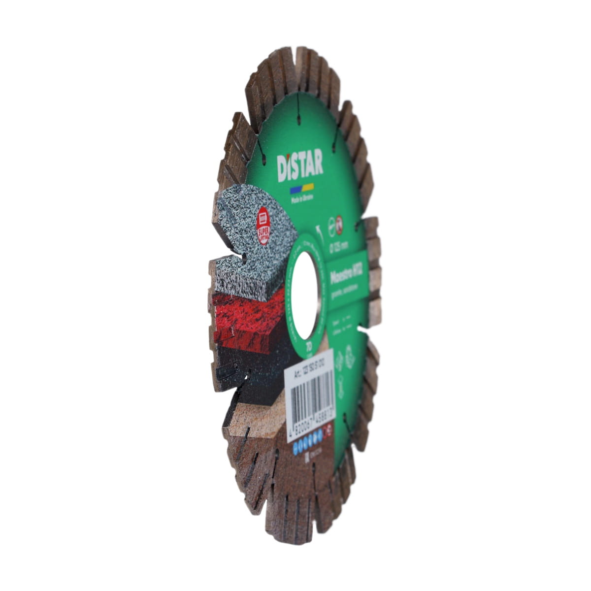 Tarcza DISTAR MAESTRO przedstawiona w dwóch odmianach o średnicy 125 i 230 mm. Przy cięciu 30 mm granitu Emelyanowskiego wykazuje resurs do 6,3 metrów kwadratowego i 230 metrów bieżących, przy wydajności 1,5 m.b./min.