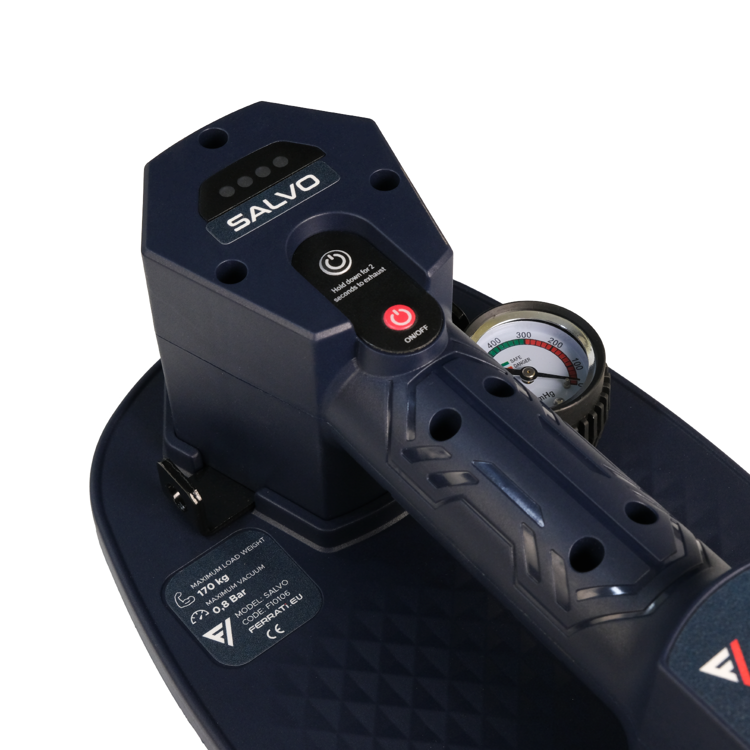 Przyssawka próżniowa automatyczna SALVO to w pełni automatyczny chwytak próżniowy o dużej sile udźwigu to najbardziej zaawansowane narzędzie wspomagające transportowanie. Wyposażony w zaawansowaną elektronikę automatycznie monitoruje podciśnienie i w przypadku jego utraty pompa próżniowa jest wywoływana do czasu przywrócenia wymaganej wartości. Znacznie zwiększa to wydajność akumulatora oraz zapewnia bezpieczeństwo w trakcie przenoszenia. Pomiar ciśnienia i wagi odbywa się w czasie rzeczywistym wpływając pozytywnie na czas reakcji. Efektywnie wyzwalana pompa o wysokiej wydajności przepływu powietrza sprawia, że czas operacyjny do uzyskania pełnej nośności chwytaka jest stosunkowo krótki. Wielowarstwowa uszczelka próżniowa z gumy piankowej jest mocna i odporna na utratę podciśnienia, mocno przylega do wymagających powierzchni. Przyssawka próżniowa automatyczna SALVO dostarczana jest w praktycznej walizce, aby chronić i bezpiecznie transportować produkt.