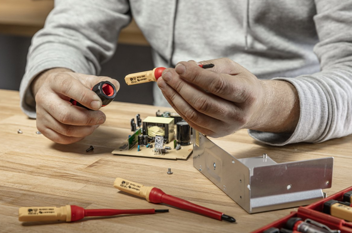 Zestaw wkrętaków izolowanych 1000 V z wymienną rękojeścią z próbnikiem napięcia przeznaczonym do wykrywania napięcia w gniazdkach.