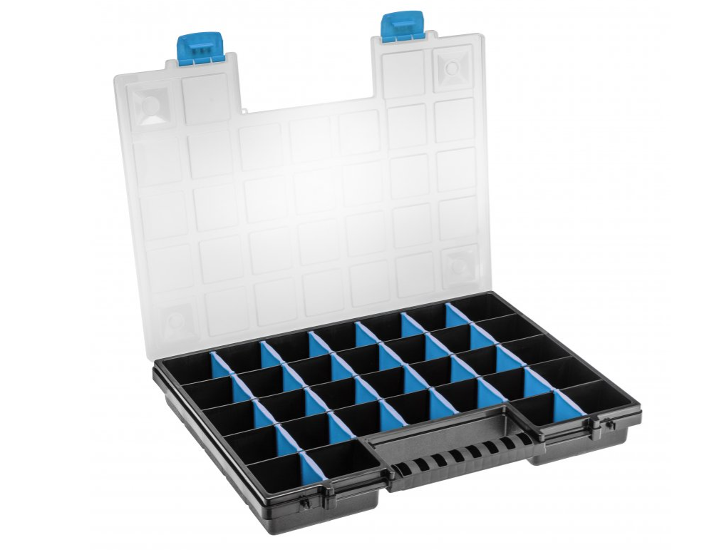 Uniwersalny organizer z regulowanymi przegrodami, umożliwiający wygodne przechowywanie drobnych elementów. Wykonany z wysokiej jakości materiałów gwarantujących trwałość i niezawodność produktu.