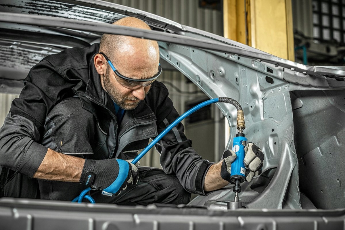 Pneumatyczna szlifierka prosta, do szlifowania, usuwania zadziorów, frezowania i grawerowania różnych detali z użyciem ściernic trzpieniowych, ściernic polerskich, ściernic polerskich filcowych oraz paskowych tarcz ściernych.