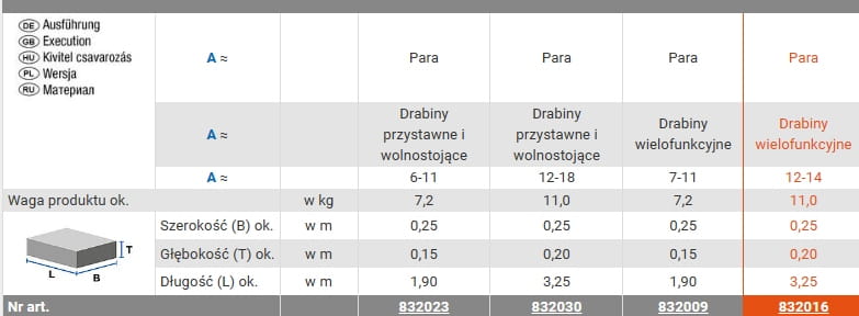 - Dostępne dwa warianty: stały i obrotowy; wariant stały do drabin wolnostojąych i przystawnych; obrotowy do rozstawno-przystawnych i wielofunkcyjnych