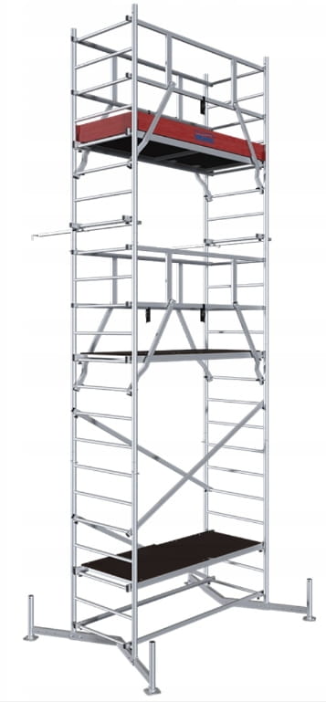 - Dolna część ramy podstawy w kształcie litery V zwiększa stabilność rusztowania i powierzchnię podparcia w kierunku wzdłużnym oraz poprzecznym, co umożliwia pracę blisko ścian i wysoki poziom bezpieczeństwa.