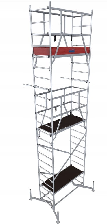 - Profilowane szczeble antypoślizgowe, zamontowane na ramie pionowej, zapewniają bezpieczeństwo podczas wchodzenia od wewnętrznej strony rusztowania.