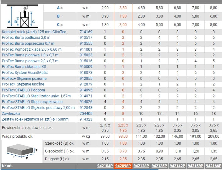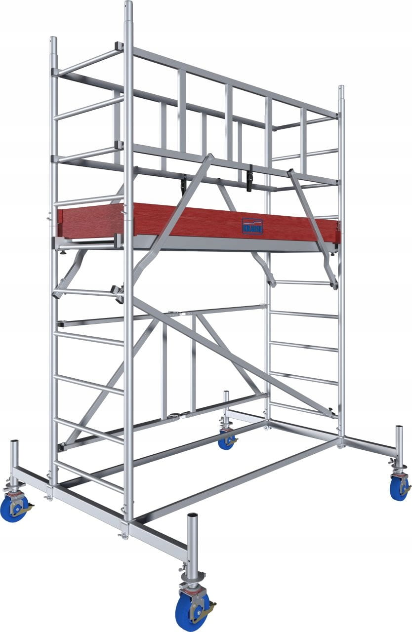 - Zmontowane rusztowanie podstawowe w wysokości 1,80 może bez problemu przejeżdżać przez otwory drzwiowe i może być rozbudowywane do 13,80 m wysokości roboczej