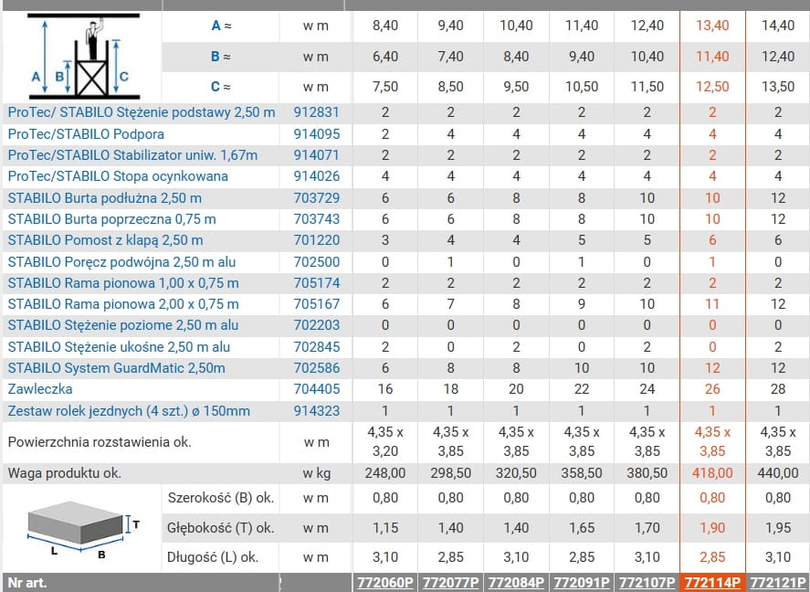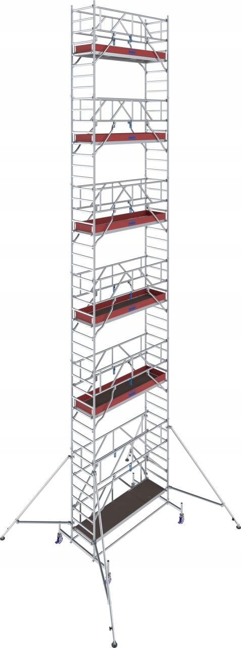 - Łatwe w montażu podpory z bezstopniową regulacją oraz teleskopową stopą (zakres regulacji do 230 mm) zapewniające dodatkową stabilizację i bezpieczne użytkowanie w konstrukcjach od wysokości roboczej 7,40 m