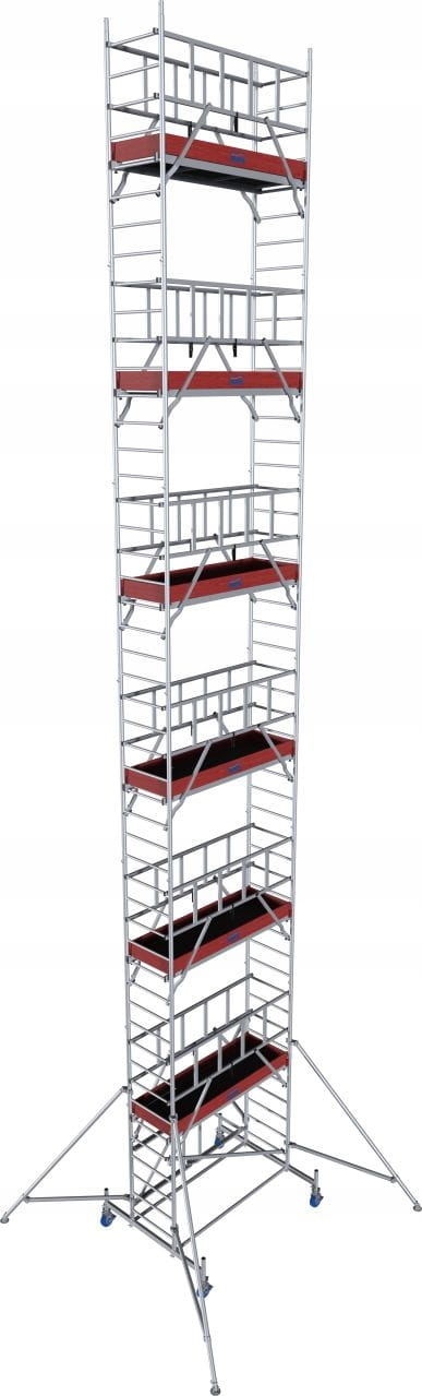 - Zmontowane rusztowanie podstawowe w wysokości 1,80 może bez problemu przejeżdżać przez otwory drzwiowe i może być rozbudowywane do 13,80 m wysokości roboczej