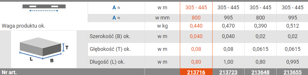 - Zakres regulacji (otwór podłużny) od 305 mm do 445 mm