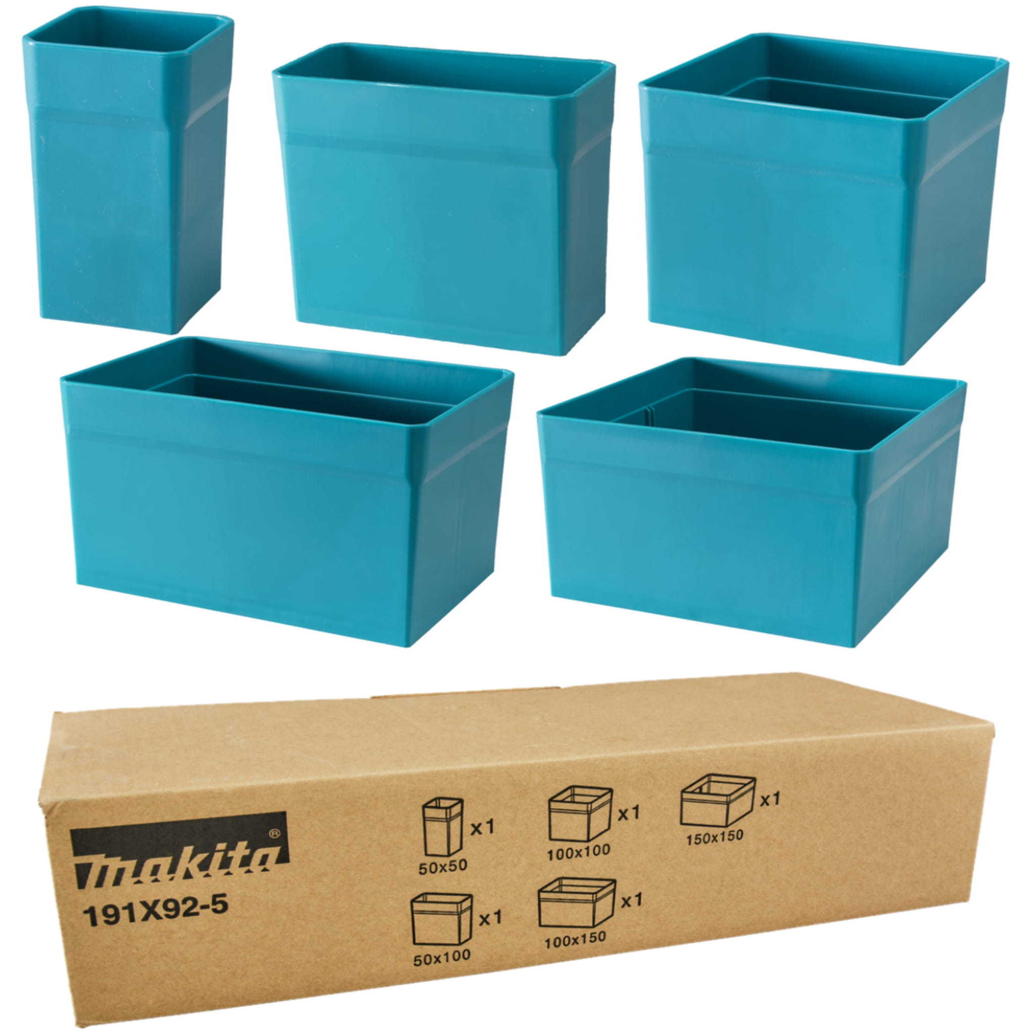 Zestaw 5 plastikowych wkładek do organizera Makita Makpac; dzięki temu możesz stworzyć układ według własnych upodobań w organizerze Makpac. Zestaw ten składa się z następujących wymiarów: 150x150mm, 100x150mm, 100x100mm, 50x100mm i 50x50mm. Wysokość pudełek to 94mm.