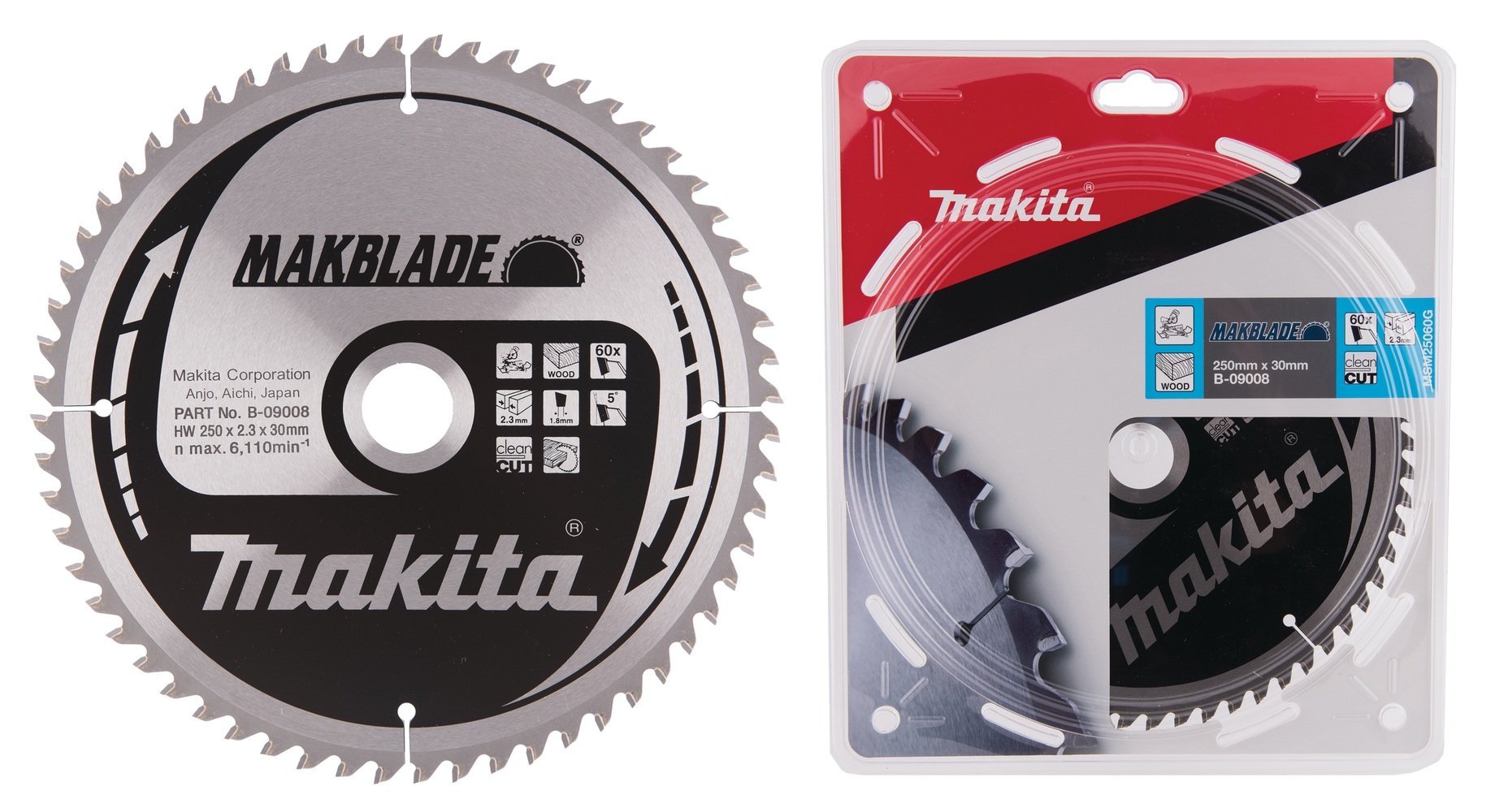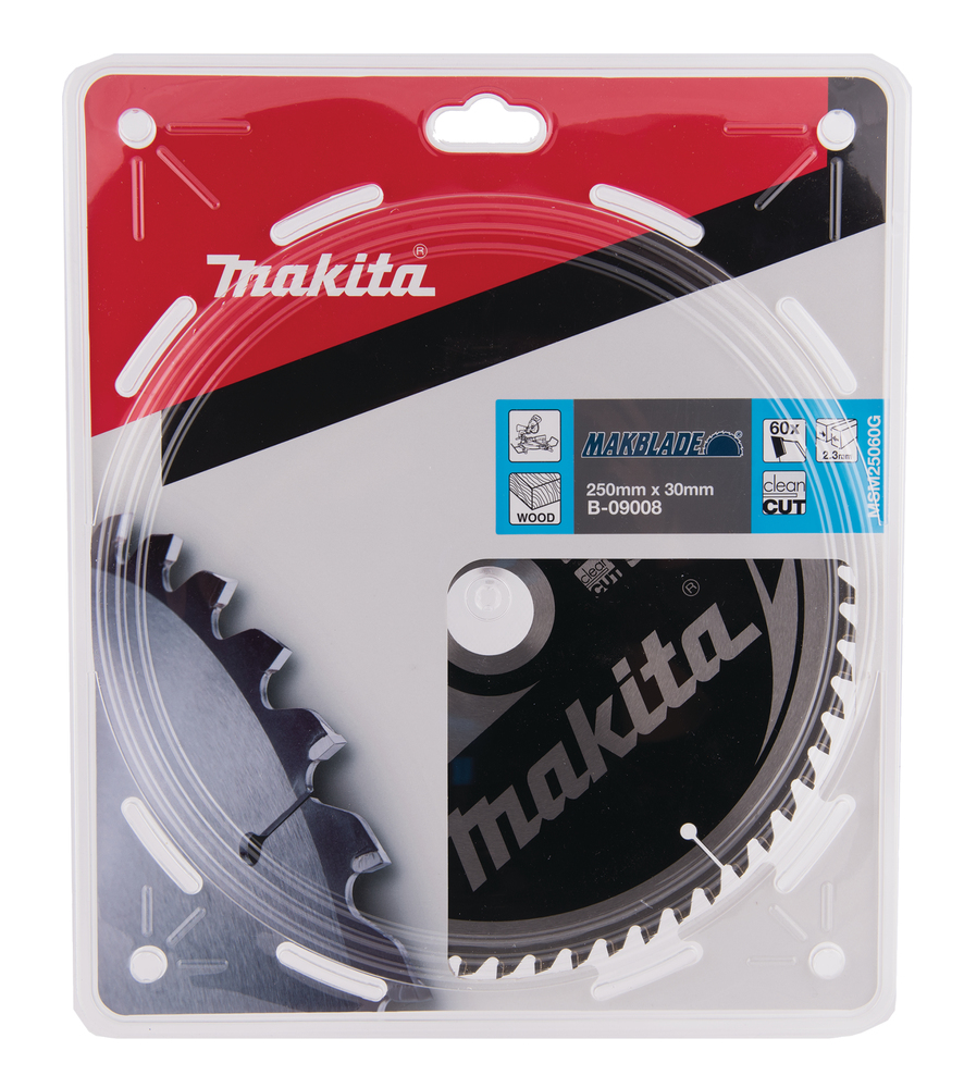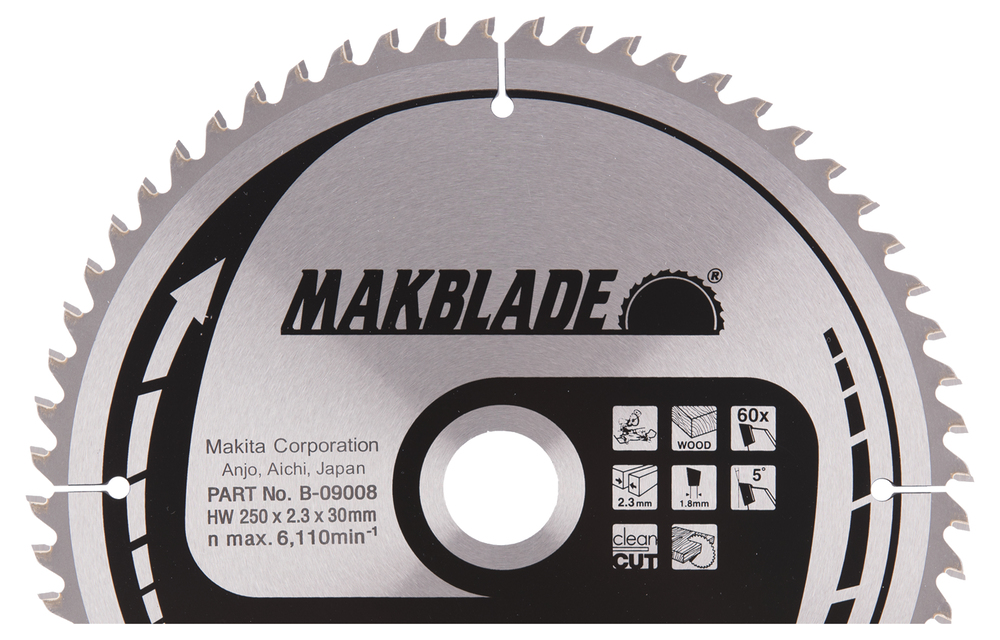 Tarcza MakBlade do pił tarczowych ma średnicę 250 mm i posiada 60 zębów do cięcia drewna. Pozostawia czysty ślad po cięciu i nadaje się do użytku z piłami ukośnymi. Tarcza jest wyposażona w zęby z węglika spiekanego dla zwiększenia wydajności. Ma szerokość rzazu 2,3 mm i otwór 30 mm.