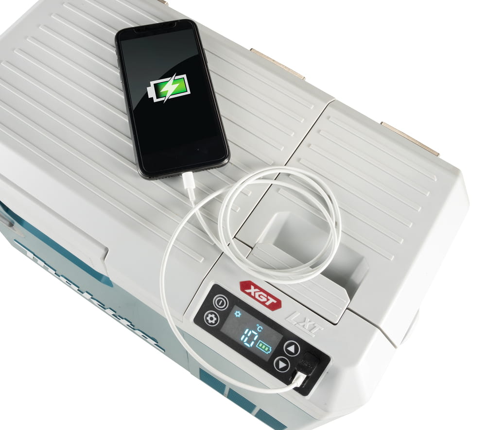 Wskaźnik naładowania akumulatorów oraz wyświetlacz LED pozwalaja na bezproblemowe odczytanie temperatury wewnątrz urządzenia. Ikony na wyświetlaczu LED informujące o trybie pracy urządzenie (chłodzenie / ogrzewanie). Chłodziarko ogrzewacz posiada wygodne uchwyty transportowe oraz port USB, do ładowania urządzeń mobilnych umieszczony wewnątrz pojemnika na akumulatory.