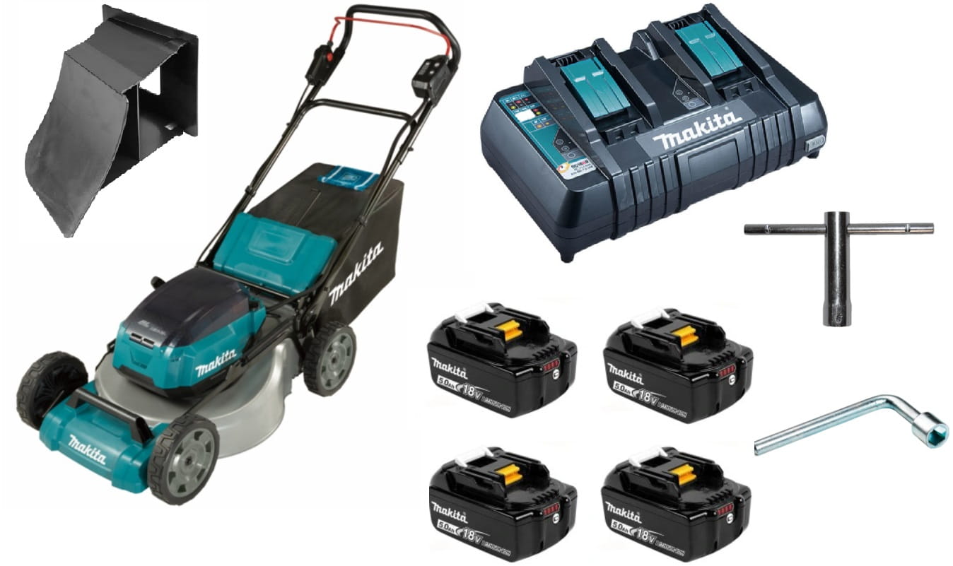 Dostarczana z 4 akumulatorami BL1850B (18 V / 5,0 Ah) i ładowarką DC18RD pozwalającą ładować 2 akumulatory jednocześnie