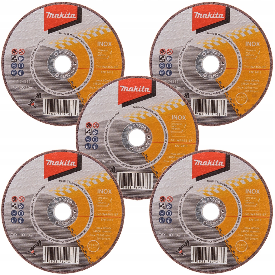 - 1 opakowanie tarcz 76x1mm do cięcia metalu i stali nierdzewnej (INOX) 5 sztuk Makita D-74815