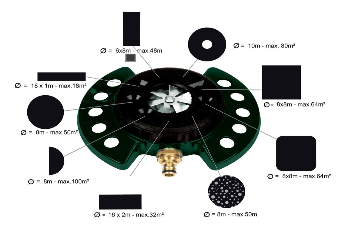 - 9 konfiguracji powierzchni nawadniania, od okręgu lub prostokątu po rozproszoną mgłę