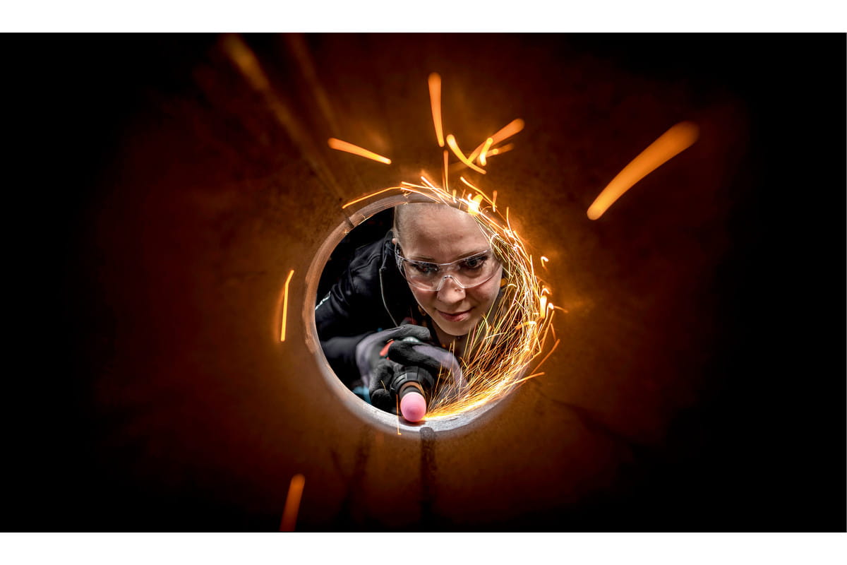 - Akumulatorowa szlifierka prosta o smukłej konstrukcji wyposażona w długie wrzeciono szlifierskie do usuwania zadziorów, frezowania, szlifowania i przecinania – nawet w trudno dostępnych miejscach