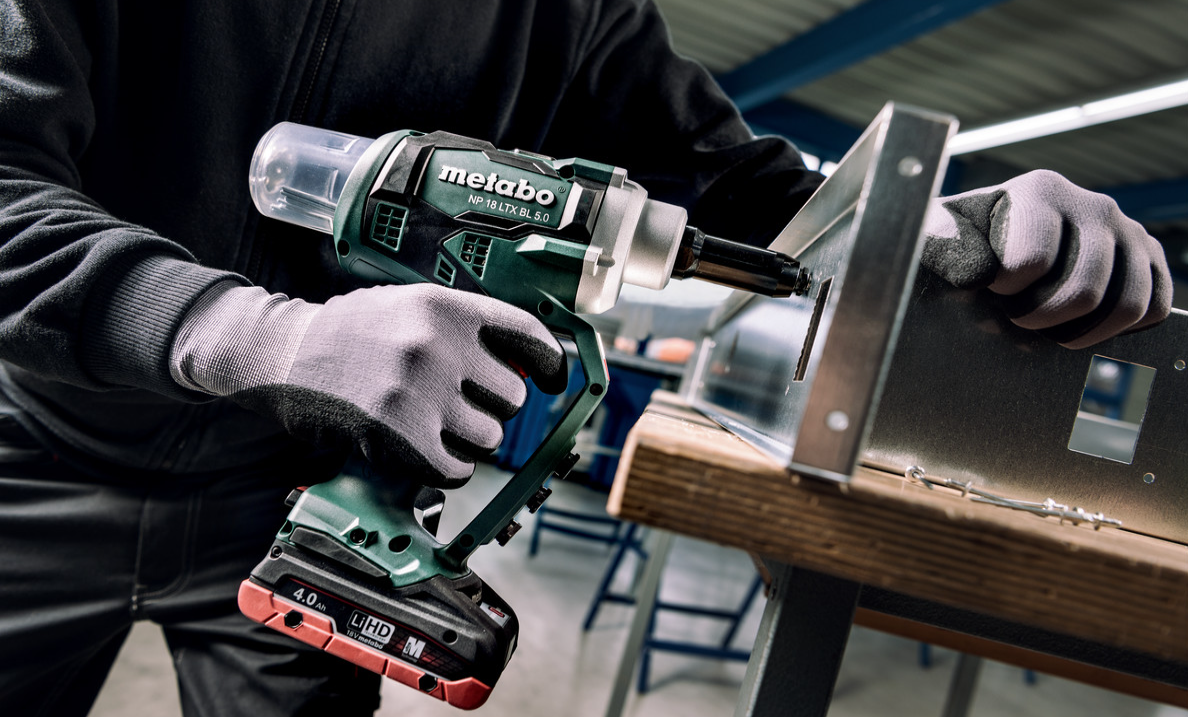 • Akumulatorowa nitownica pistoletowa do bardzo szybkiego nitowania z prędkością porównywalną do nitownic pneumatycznych