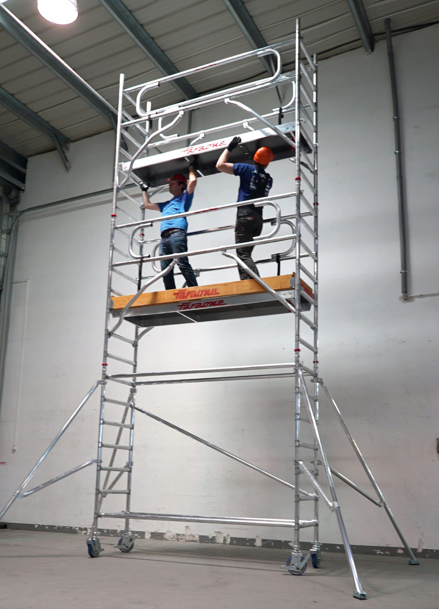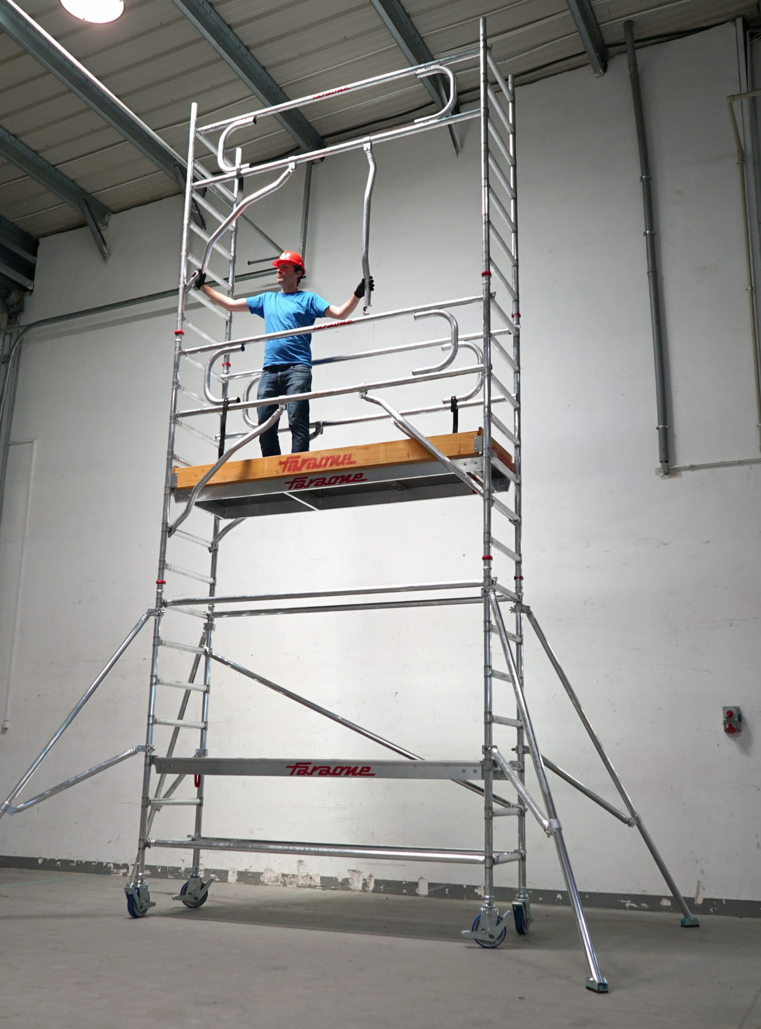 Wieża zbudowana jest z rur aluminiowych o średnicy 50 mm. Składa się z lekkich i wygodnych w montażu ram. System Bezpiecznego montażu górnego obszaru roboczego odbywa się z dolnego poziomu w całkowicie bezpieczny sposób. Wieże jezdne TOP SYSTEM FARAONE są gwarantem bezpiecznej pracy. Operator pracuje na bardzo bezpiecznym, antypoślizgowym podeście roboczym mocowanym na haki. Podesty zabezpieczone są drewnianymi bortnicami. Łatwe przemieszczanie wież zapewniają wytrzymałe koła o średnicy 200 mm z poliamidu oblanego poliuretanem. Elementy rusztowania są odporne na korozję. Maksymalne obciążenie wynosi 280 kg.