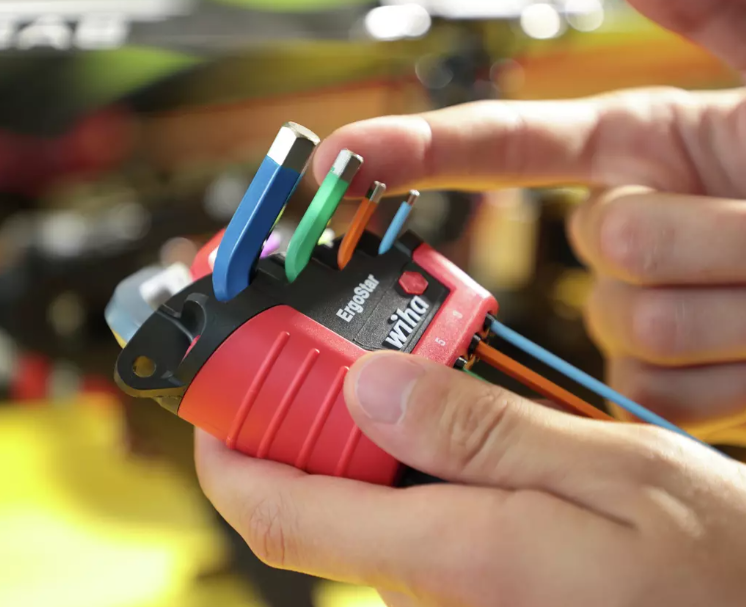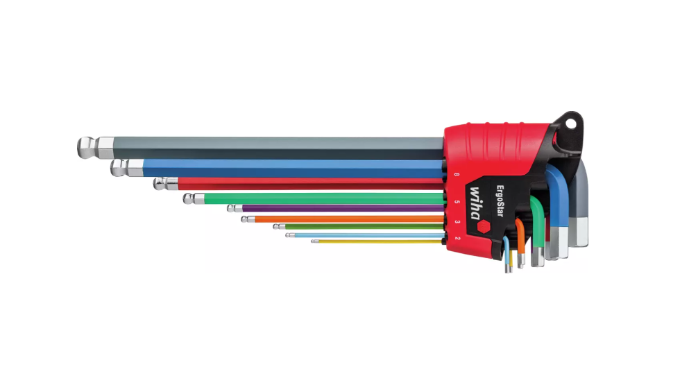 Czy to nie wydaje się znajome? Nieporęczne wyciąganie i ponowne wkładanie pojedynczych kluczy do uchwytu. Ostatecznym, a zarazem genialnym rozwiązaniem tego problemu stał się obecnie uchwyt Wiha ErgoStar. Obrócenie jednego z kluczy w uchwycie sprawia, że wszystkie pozostałe klucze obracają się w bok pod tym samym kątem, umożliwiając tym samym ich szybkie i wygodne wyjmowanie. Mocowanie zastosowane w tych uchwytach zapobiega wypadaniu kluczy niezależnie od tego, czy uchwyt jest zamknięty, czy otwarty. Ponadto kolorowe klucze dzięki pokryciu lakierem luminescencyjnym można szybko i łatwo odnajdywać nawet w ciemności za pomocą lampy UV. Dzięki temu skraca się czas poszukiwania zagubionych kluczy trzpieniowych, a podczas konserwacji urządzeń zmniejsza się ryzyko pozostawienia narzędzi wewnątrz maszyny. Zastosowanie pierścienia ze stali sprężynowej MagicRing eliminuje wypadanie normowanych śrub z gniazdem sześciokątnym z klucza niezależnie od położenia bez konieczności stosowania magnesu. Trzpień sześciokątny z główką kulistą umożliwia bezproblemowe przykręcanie pod kątem do 25°. Zestaw ten obejmuje dziewięć kolorowych sześciokątnych kluczy trzpieniowych w najczęściej stosowanych rozmiarach.