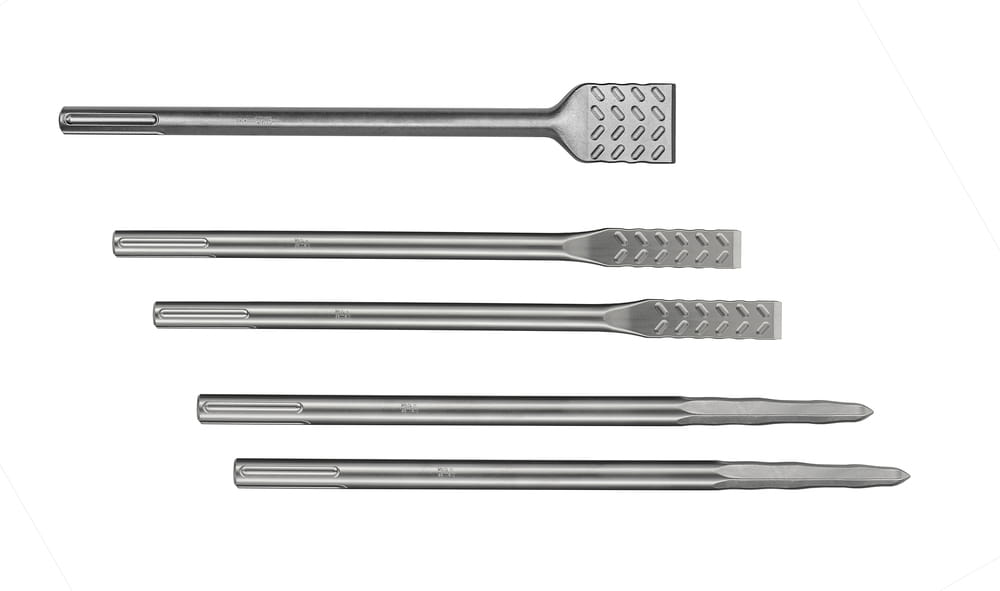 Zestaw punktaków i dłut SDS-MAX do pracy z betonem. Długość całkowita tych dłut wynosi 380-400 mm. Szerokość dłut płaskich wynosi 25 mm, a dłut do skuwania 50 mm. Opakowanie zawiera 2 punktaki, 2 dłuta płaskie i 1 dłuto do skuwania.